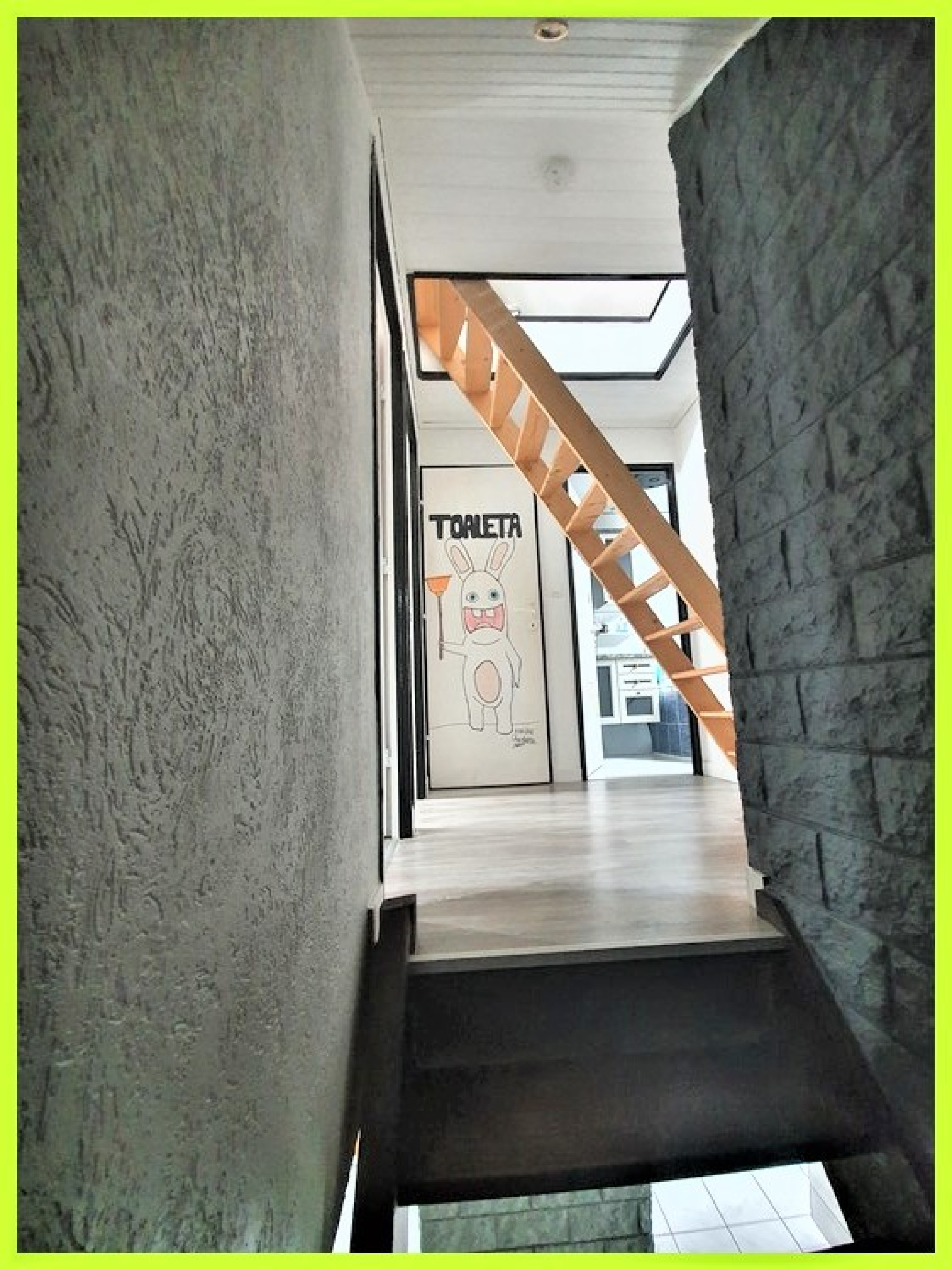 Elle comprend: 1 entrée, 1 WC séparés, 1 cuisine équipée ouverte sur un séjour de 57m² donnant sur la terrasse et le jardin.