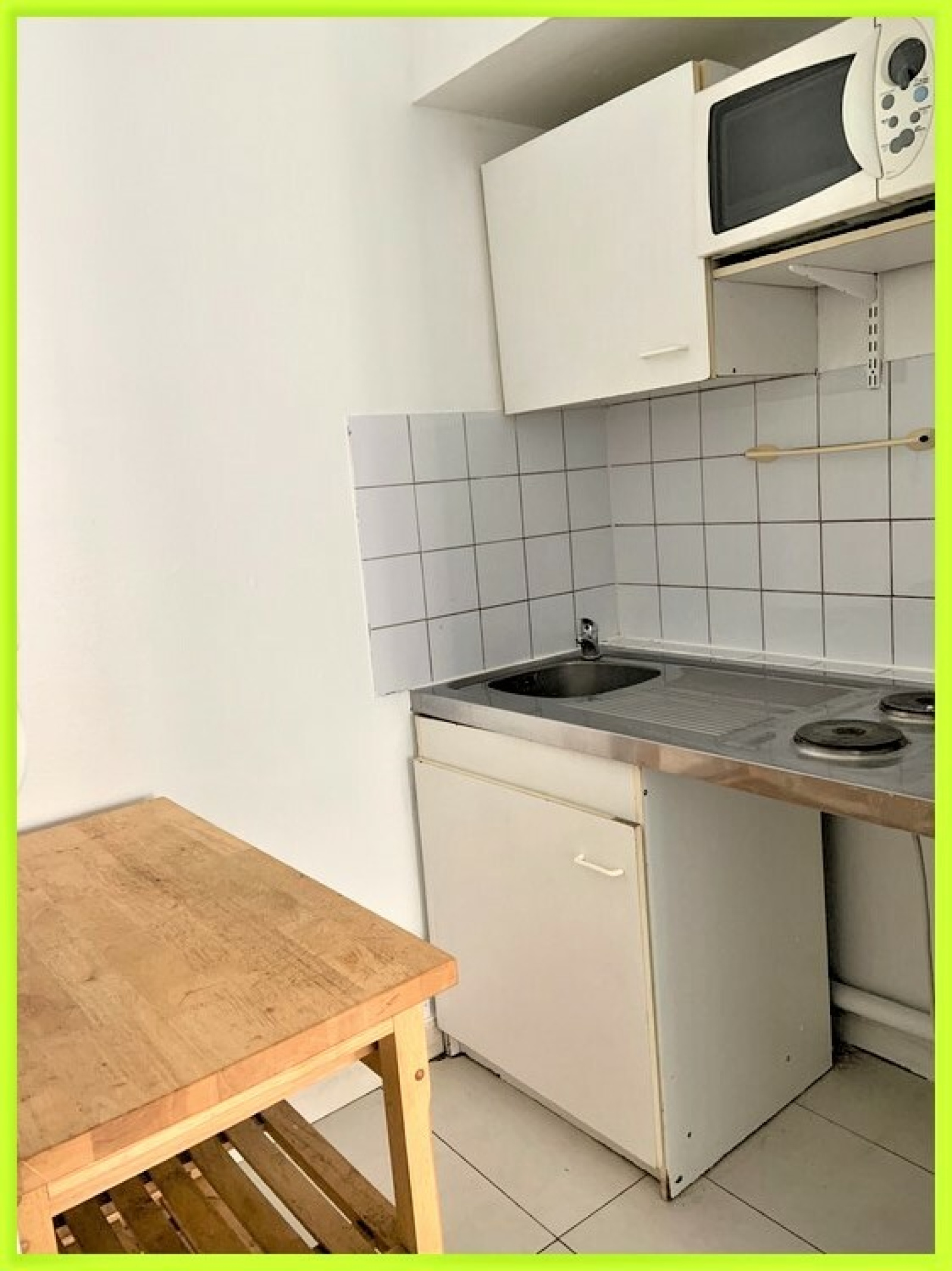 Il comprend: Un séjour avec kitchenette ouverte équipée (plaques, hotte, micro ondes), une chambre donnant sur une salle d’eau avec wc et une terrasse commune.