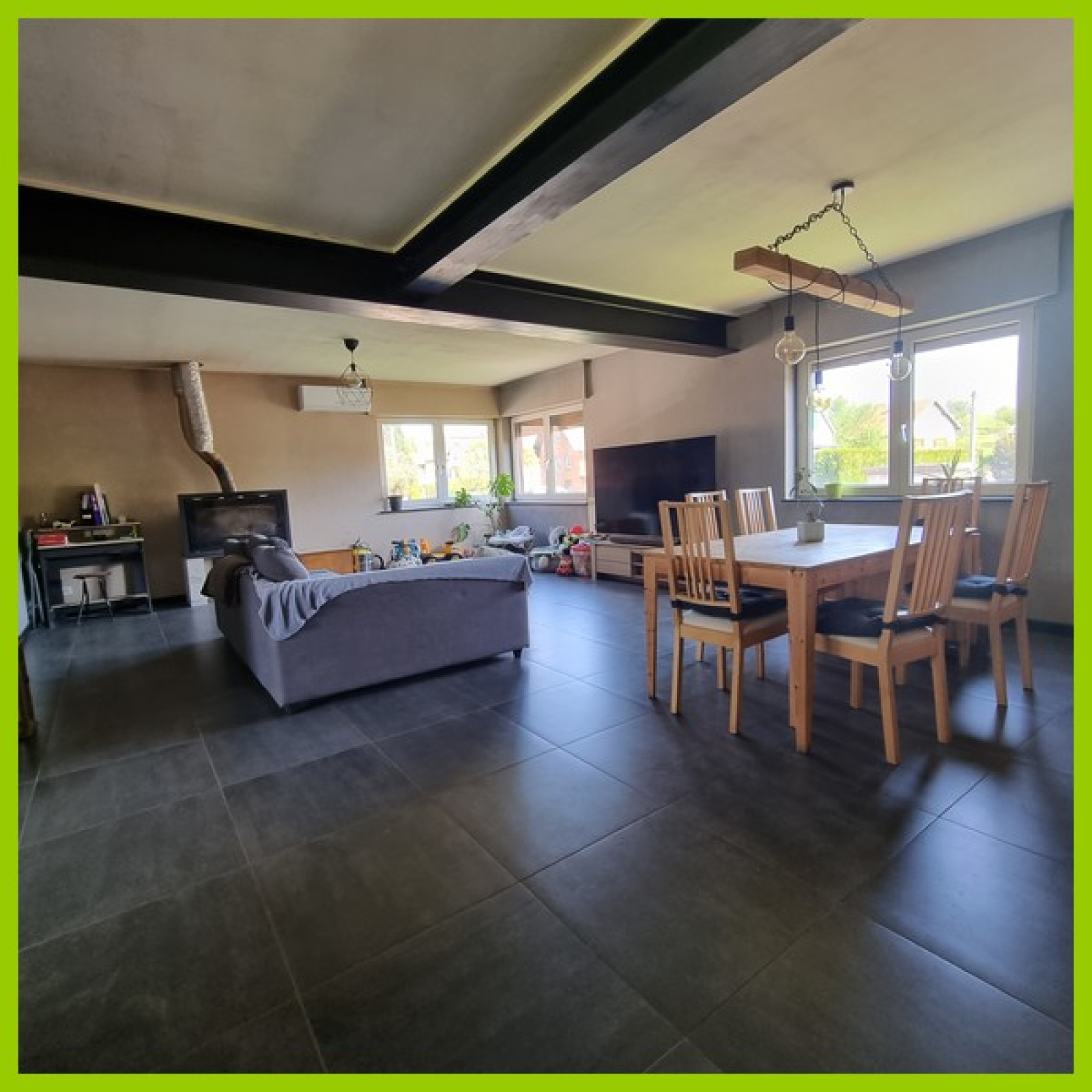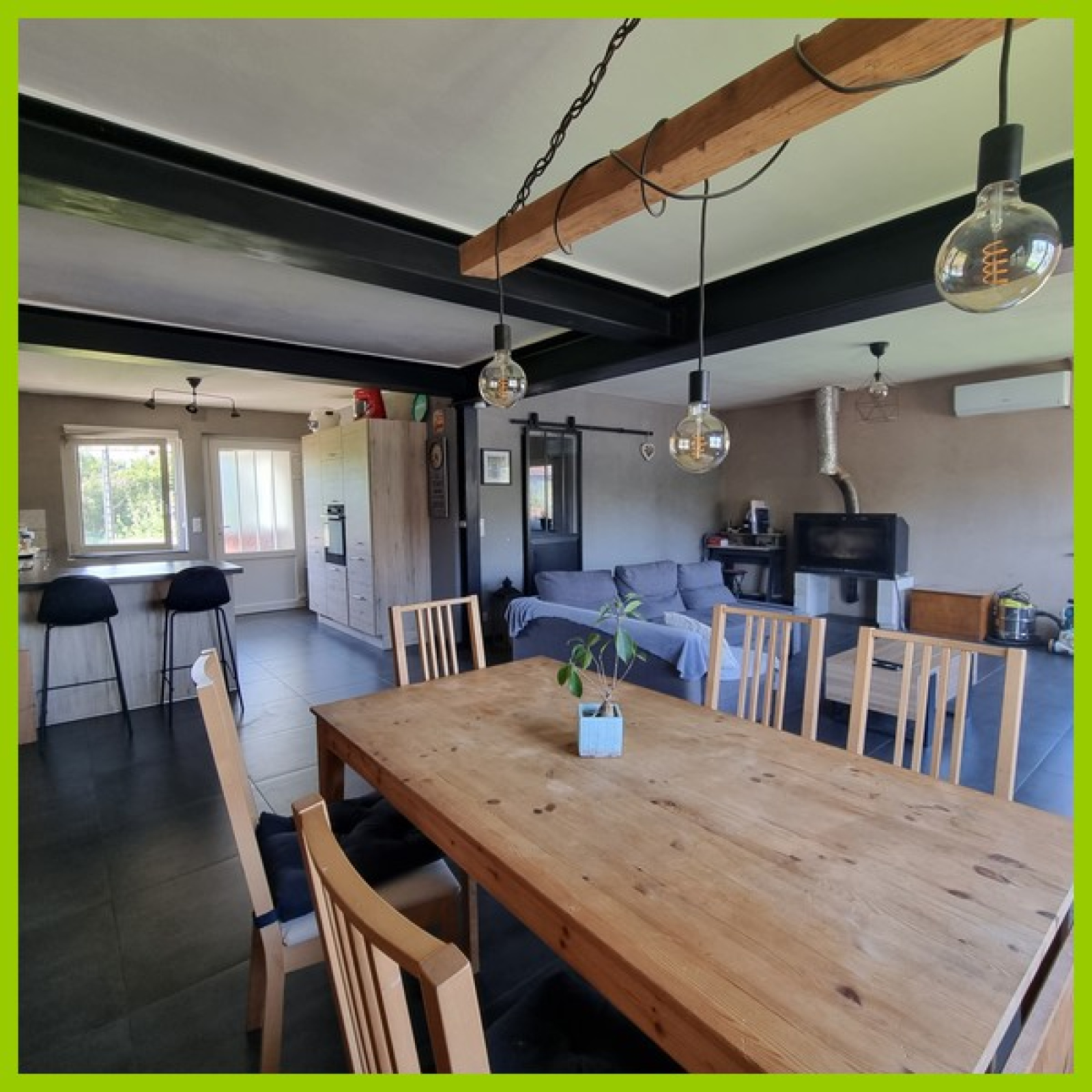 Chauffage individuel par clim réversible et cheminée.